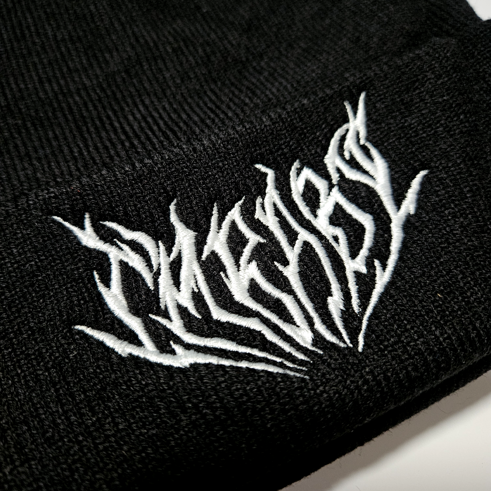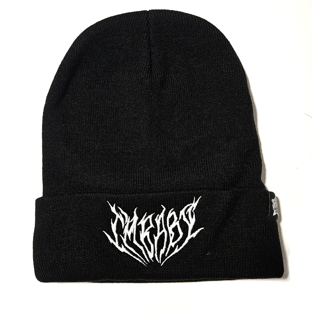 "I'm Baby" in hand-draw metal font, fully embroidered white thread on a black beanie!