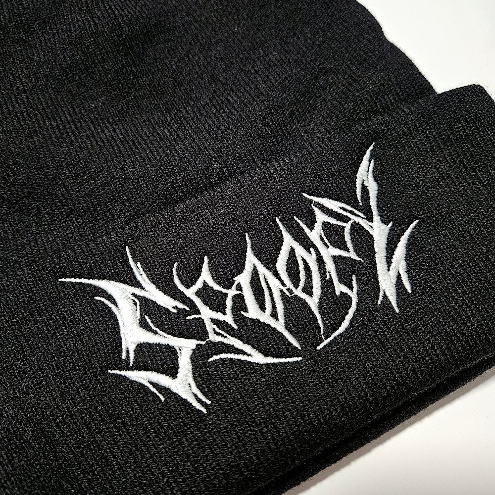 "Spoopy" in hand-draw metal font, fully embroidered white thread on a black beanie!